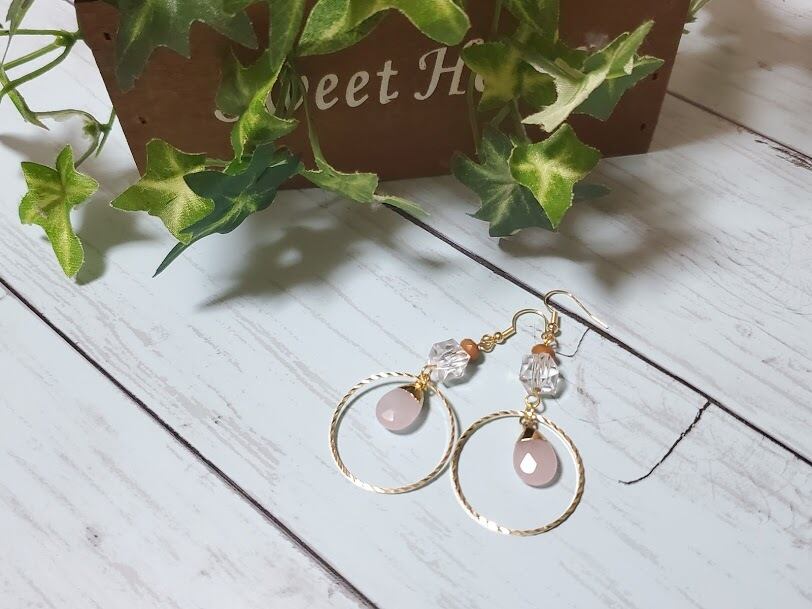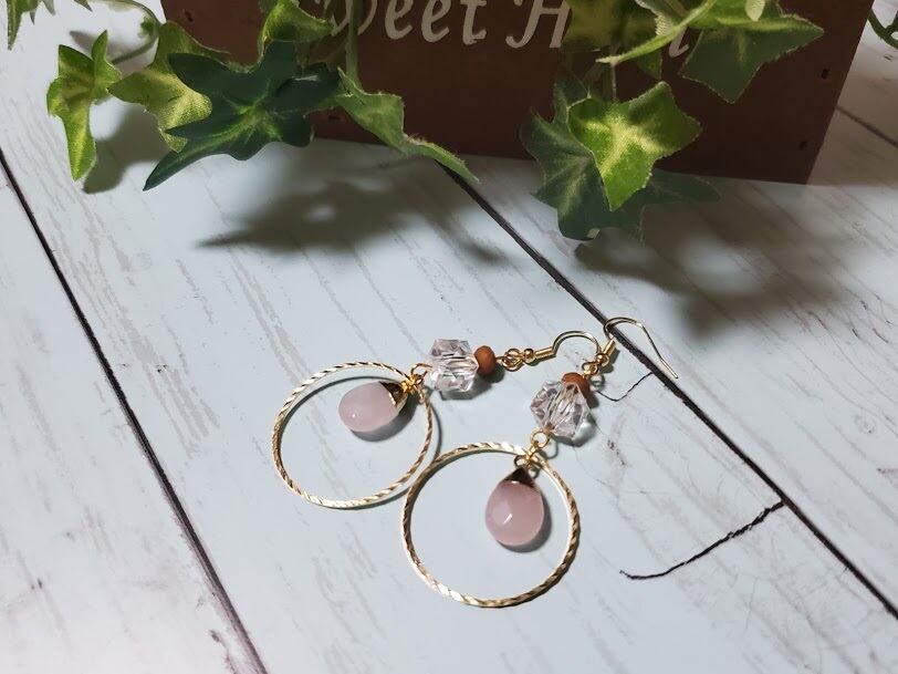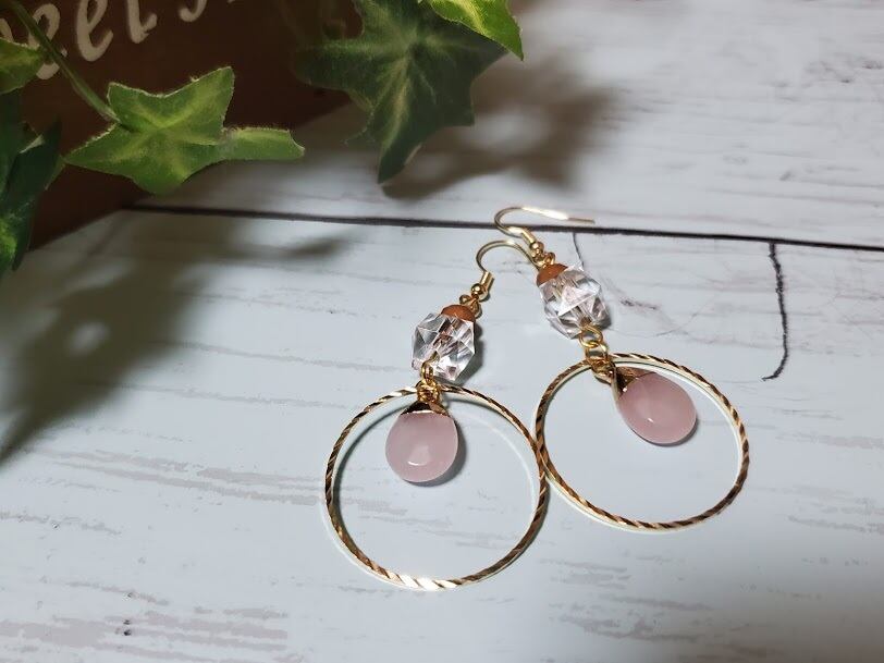 薄いピンクがかわいいローズクウォーツは、カットがきれいなしずく型がゆらゆら。